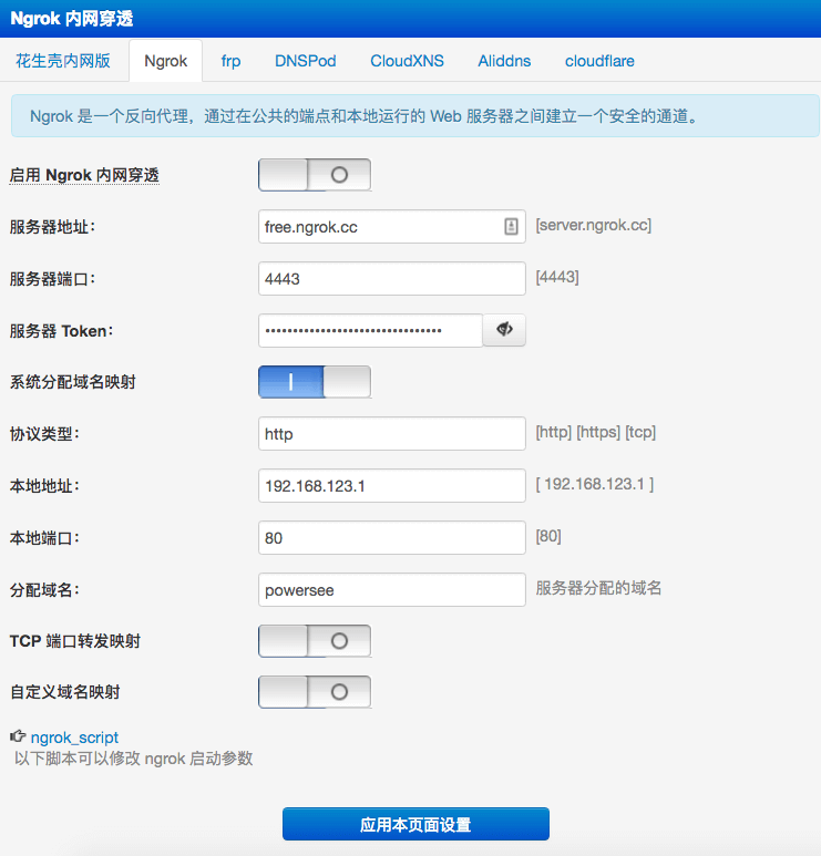 之后再把启动 【ngrok 内网穿透】的的开关打开,再应用本页面设置,此时通过访问域名